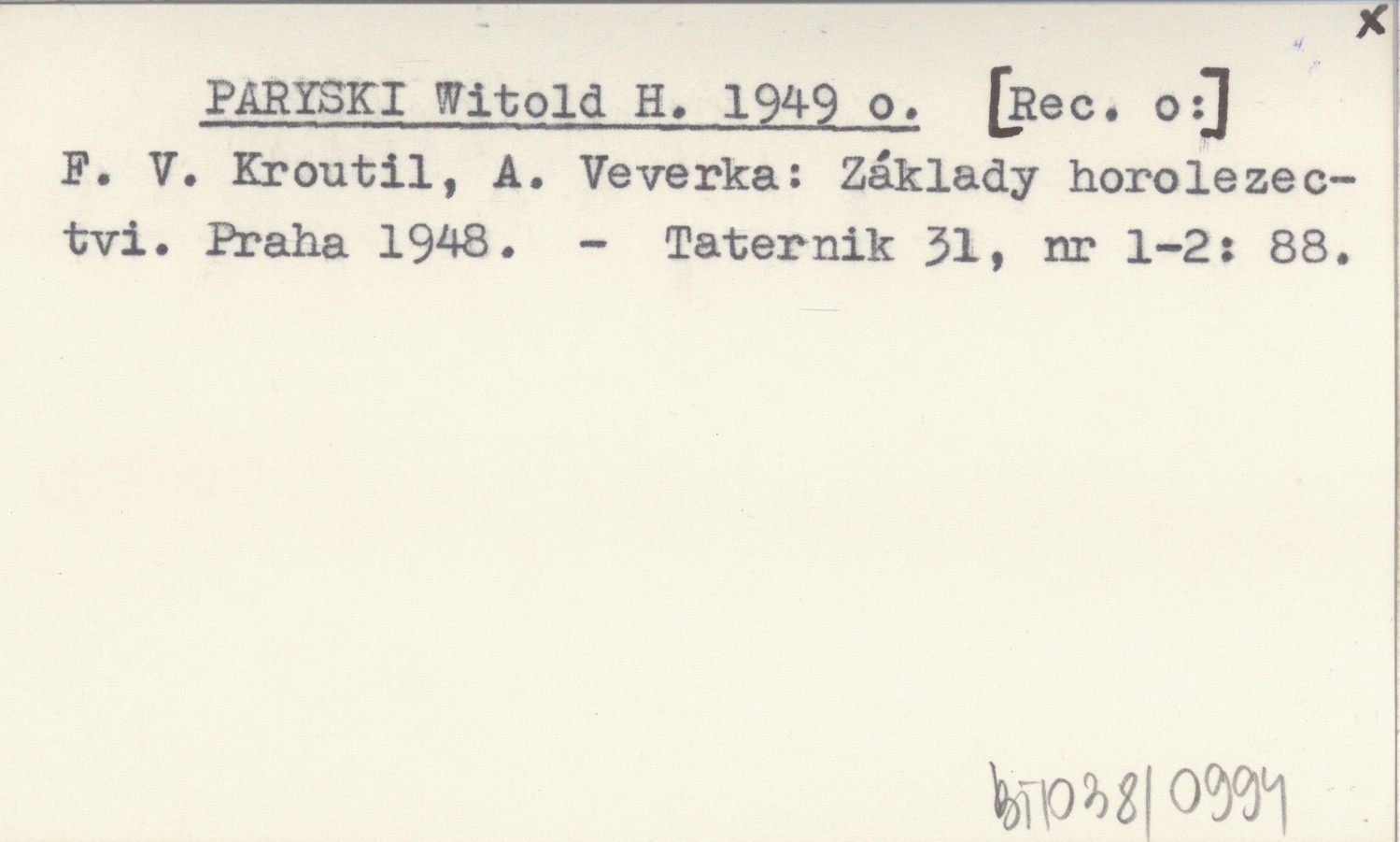 PARYSKI Witold H. 1949 o F. V. Kroutil, A. Veverka: Základy horolezectvi. Praha 1948.