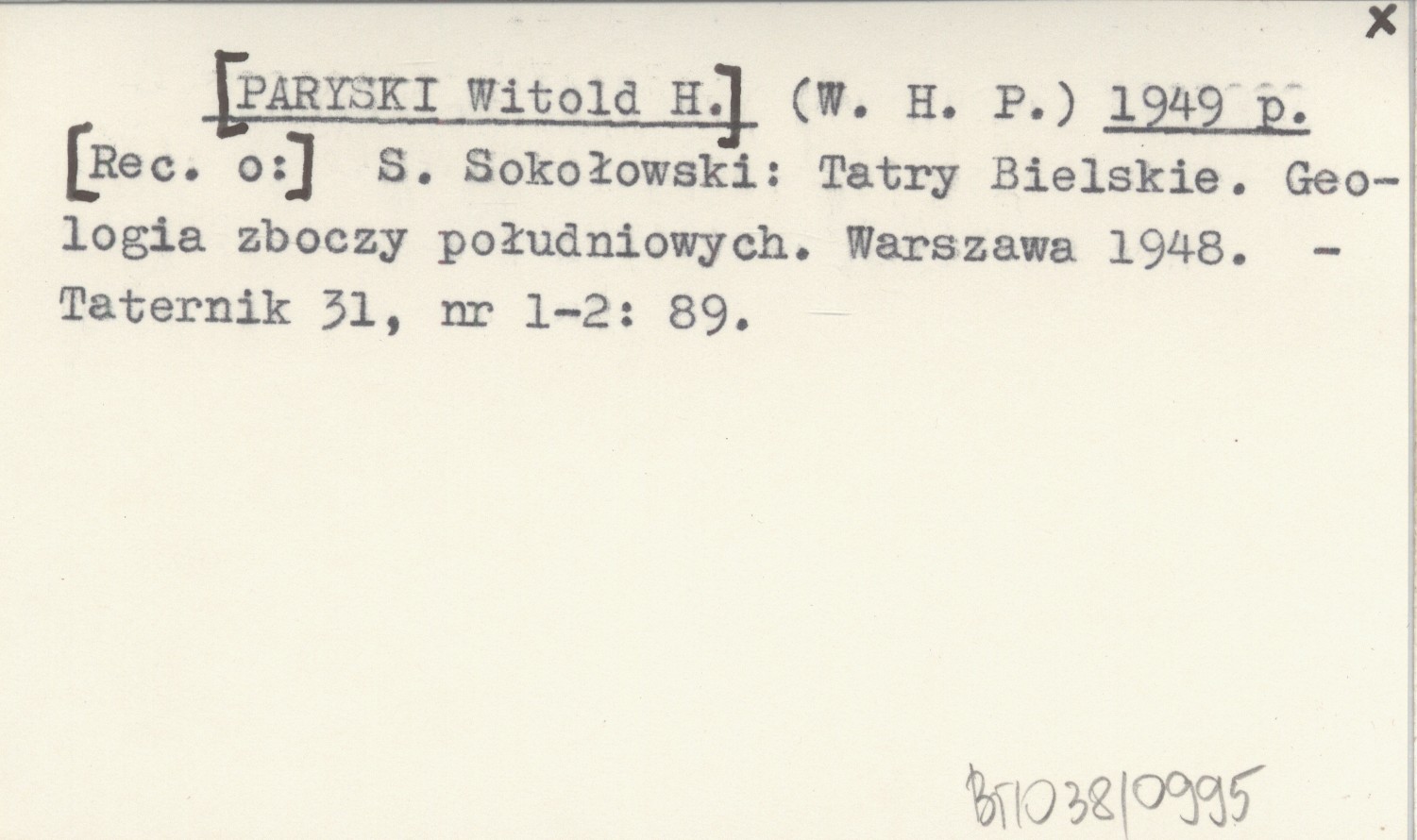 (W. H. P.) [PARYSKI Witold H.] 1949 p S. Sokołowski: Tatry Bielskie. Geologia zboczy południowych. Warszawa 1948.