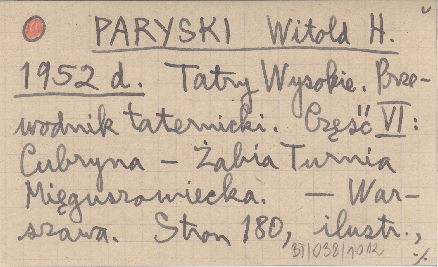 PARYSKI Witold H. 1952 d Tatry Wysokie. Przewodnik taternicki. Część VI: Cubryna - Żabia Turnia Mięguszowiecka.