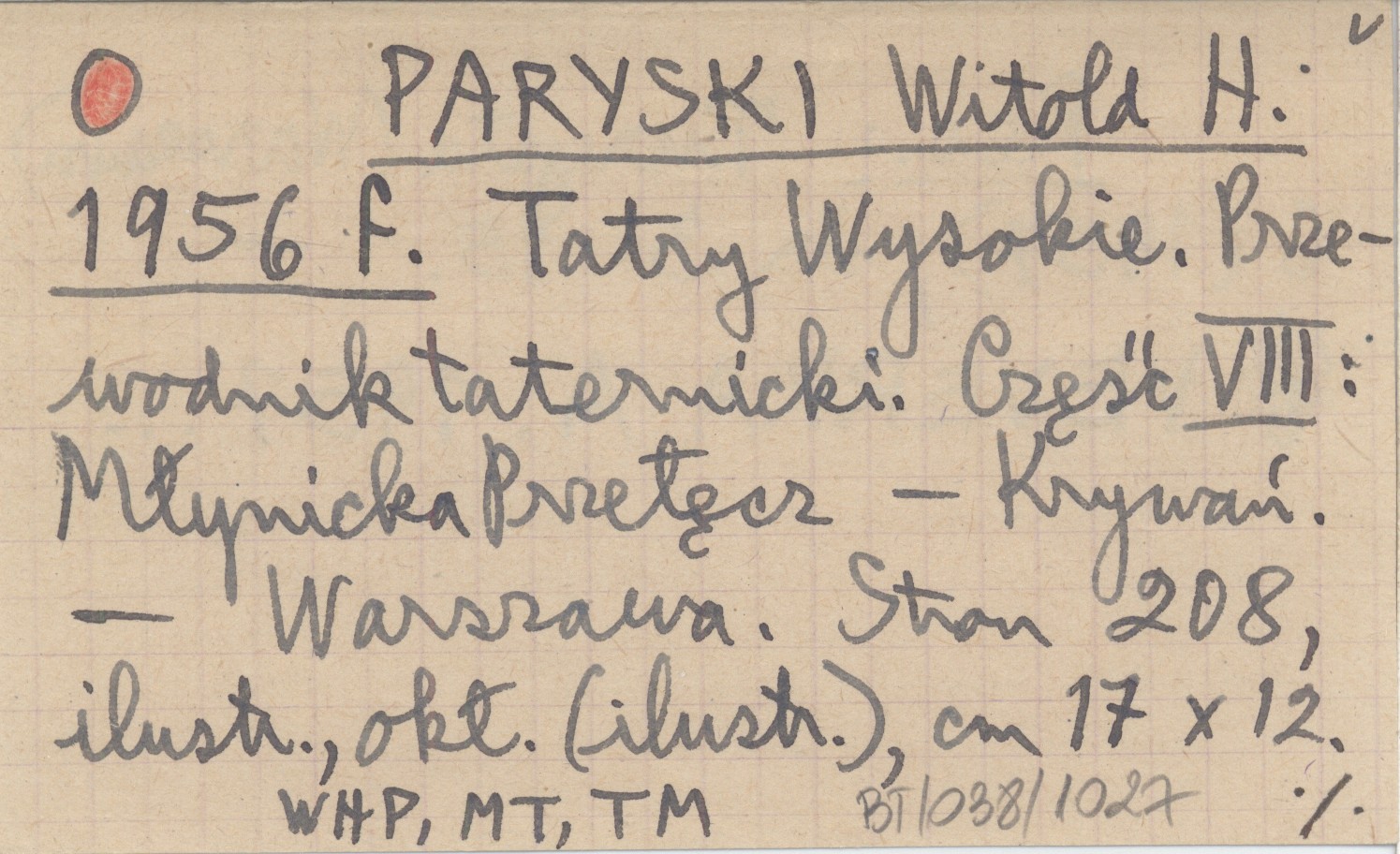 PARYSKI Witold H. 1956 f Tatry Wysokie. Przewodnik taternicki. Część VIII: Młynicka Przełęcz - Krywań.