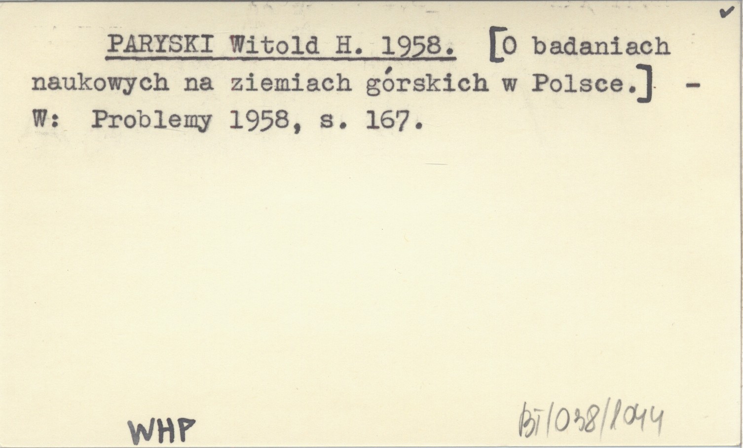 PARYSKI Witold H. 1958 [O badaniach naukowych na ziemiach górskich w Polsce].