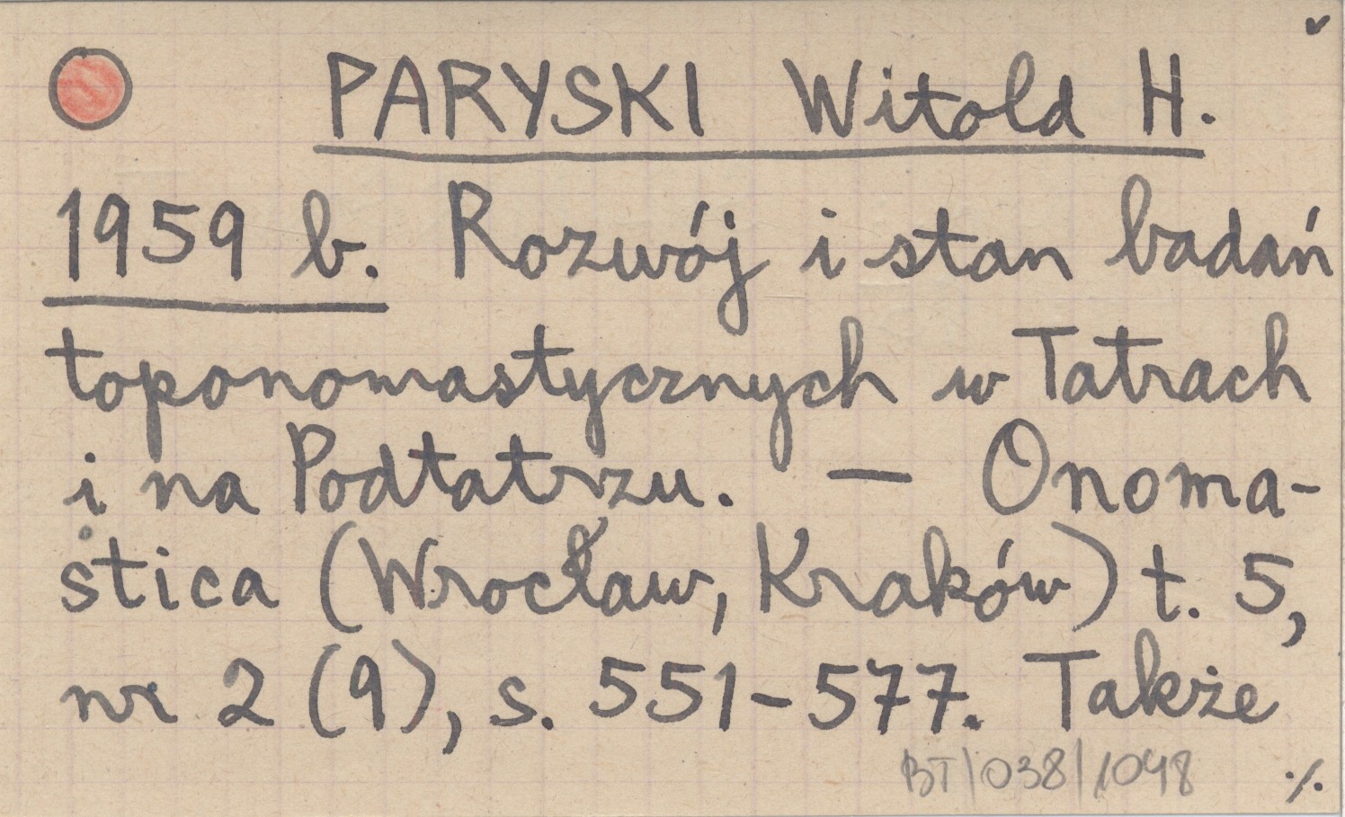 PARYSKI Witold H. 1959 b Rozwój i stan badań toponomastycznych w Tatrach i na Podtatrzu.
