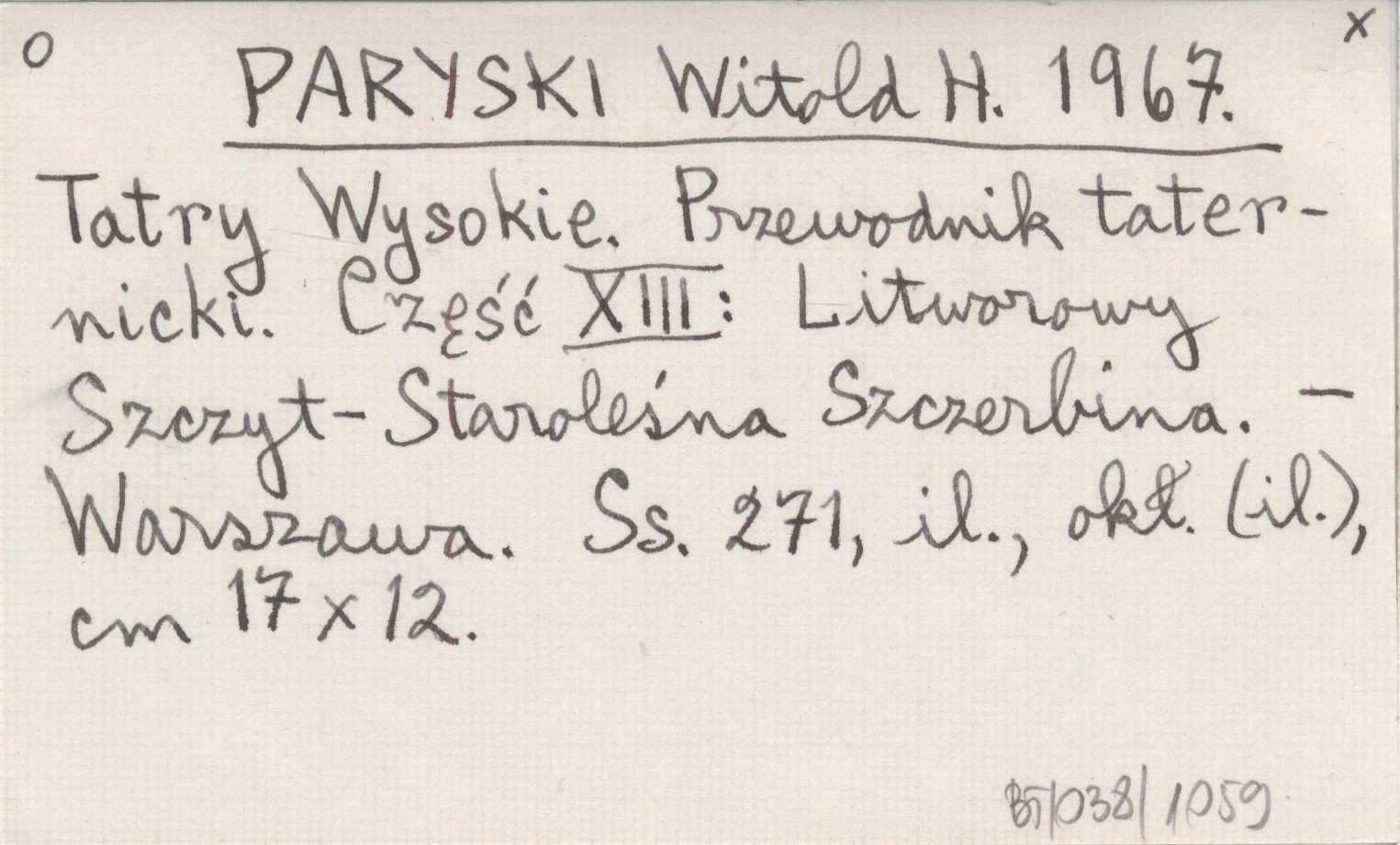 PARYSKI Witold H. 1967 Tatry Wysokie. Przewodnik taternicki. Część XIII: Litworowy Szczyt - Staroleśna Szczerbina.