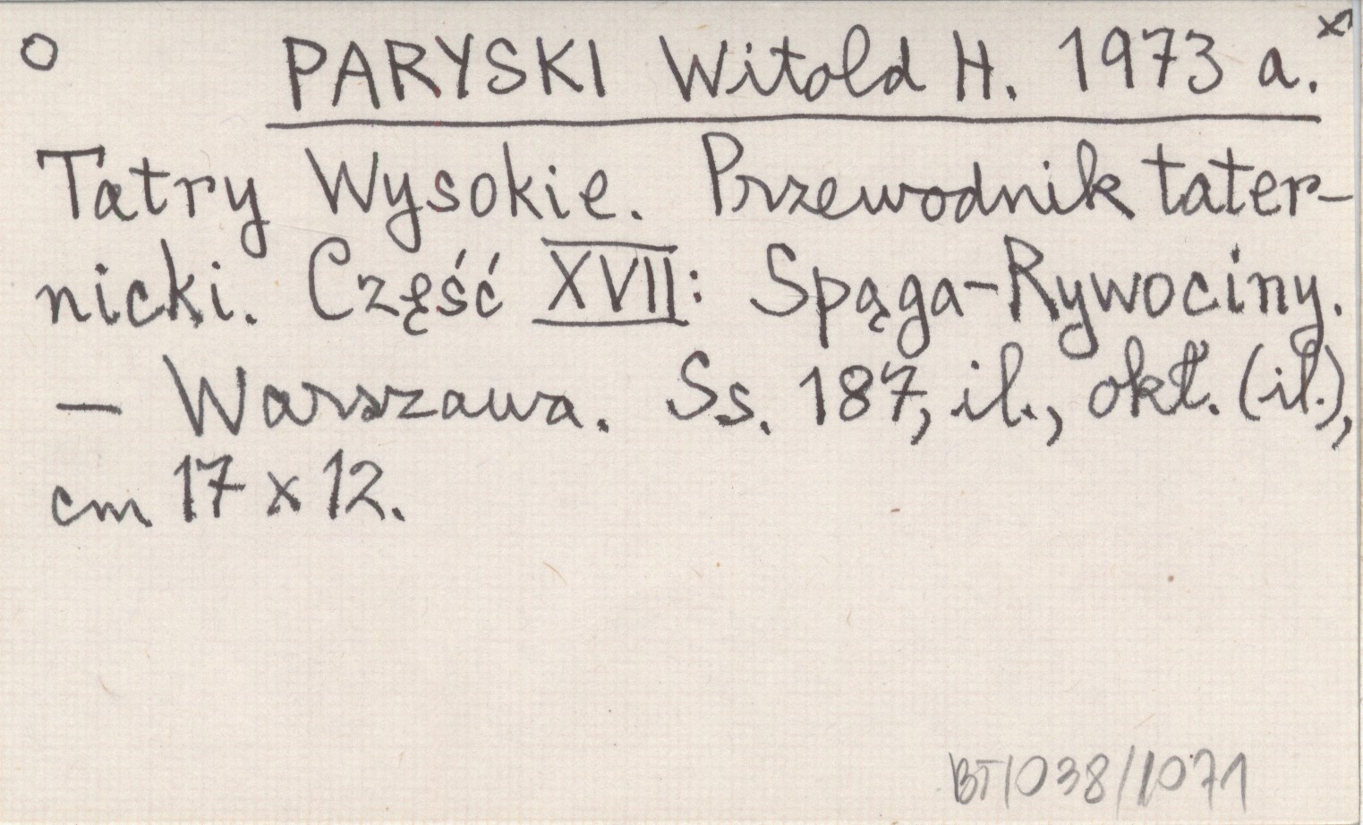 PARYSKI Witold H. 1973 a Tatry Wysokie. Przewodnik taternicki. Część XVII: Spąga - Rywociny.