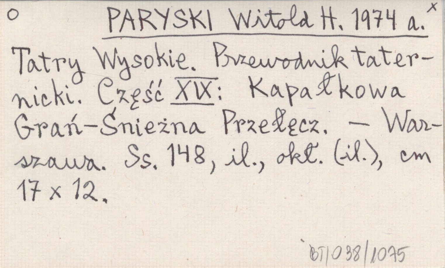 PARYSKI Witold H. 1974 a Tatry Wysokie. Przewodnik taternicki. Część XIX: Kapałkowa Grań - Śnieżna Przełęcz.