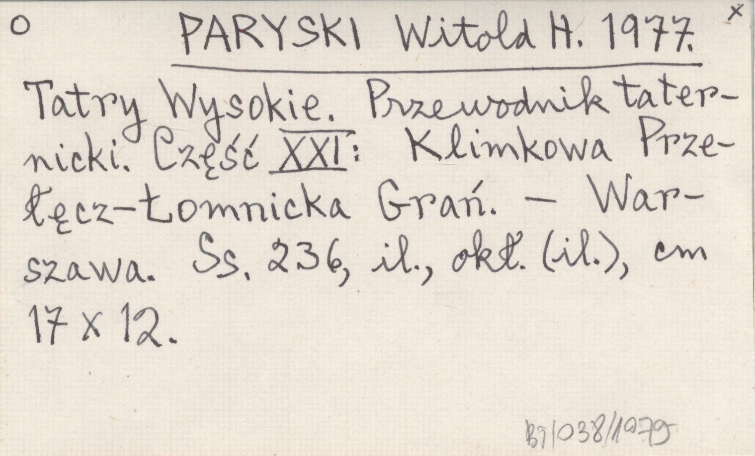 PARYSKI Witold H. 1977 Tatry Wysokie. Przewodnik taternicki. Część XXI: Klimkowa Przełęcz - Łomnicka Grań.