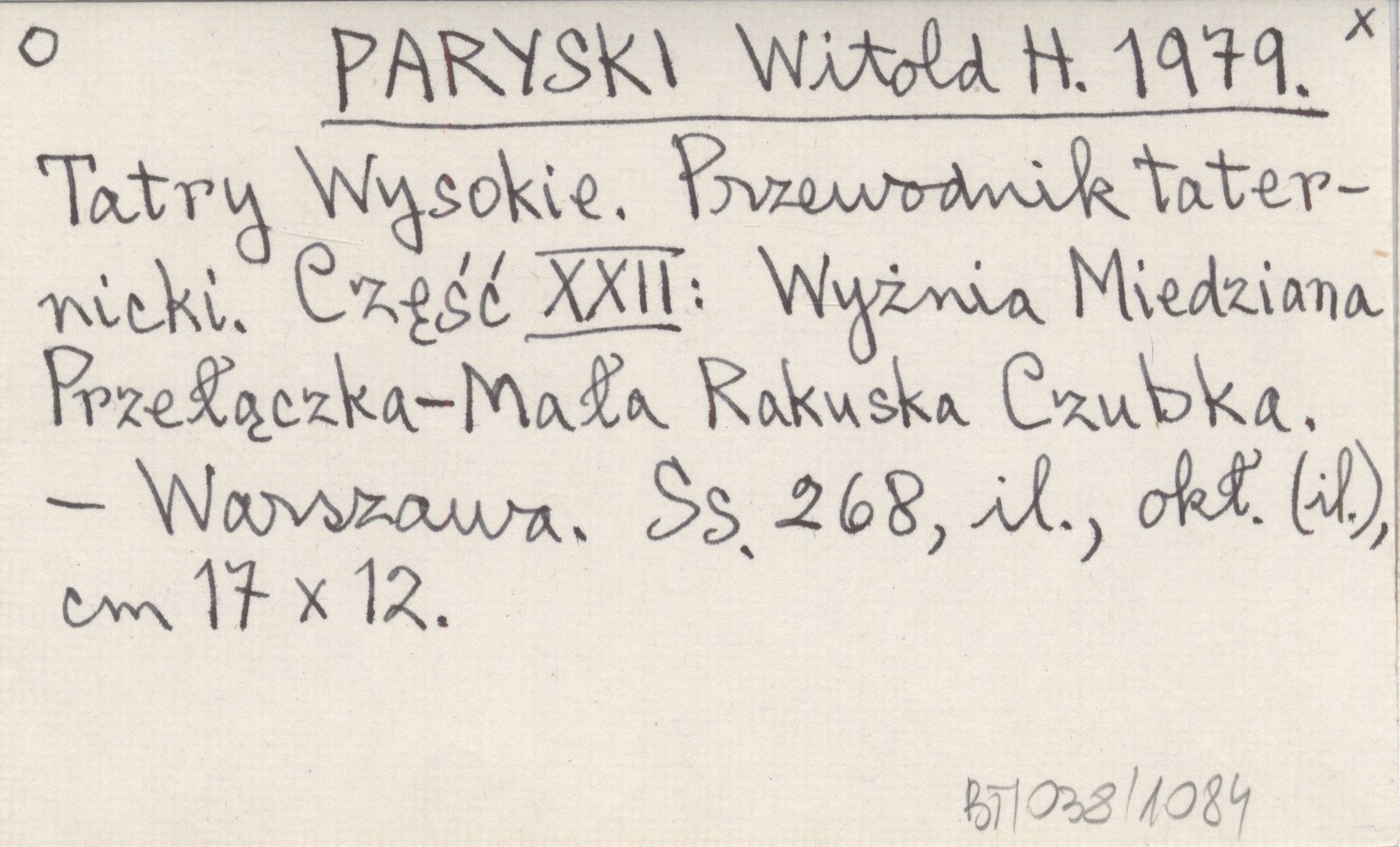 PARYSKI Witold H. 1979 Tatry Wysokie. Przewodnik taternicki. Część XXII: Wyżnia Miedziana Przełączka - Mała Rakuska Czubka.