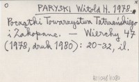 PARYSKI Witold H. 1978 Początki Towarzystwa Tatrzańskiego i Zakopane.