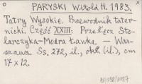 PARYSKI Witold H. 1983 Tatry Wysokie. Przewodnik taternicki. Część XXIII: Przełęcz Stolarczyka - Modra Ławka.