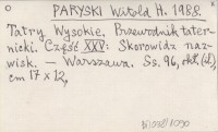 PARYSKI Witold H. 1988 Tatry Wysokie. Przewodnik taternicki. Część XXV: Skorowidz nazwisk.