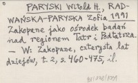 PARYSKI Witold H. RADWAŃSKA-PARYSKA, Zofia. ; 1991 Zakopane jako ośrodek badań nad regionem Tatr i Podtatrza.