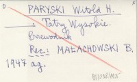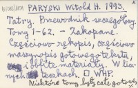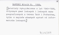 PARYSKI Witold H. 1999 [Materiały rękopiśmienne z lat 1940-1999, dotyczące gwar ludowych i ludowych nazw geograficznych z terenu Tatr i Podtatrza, tylko z zapisów własnych wprost od informatorów ludowych].