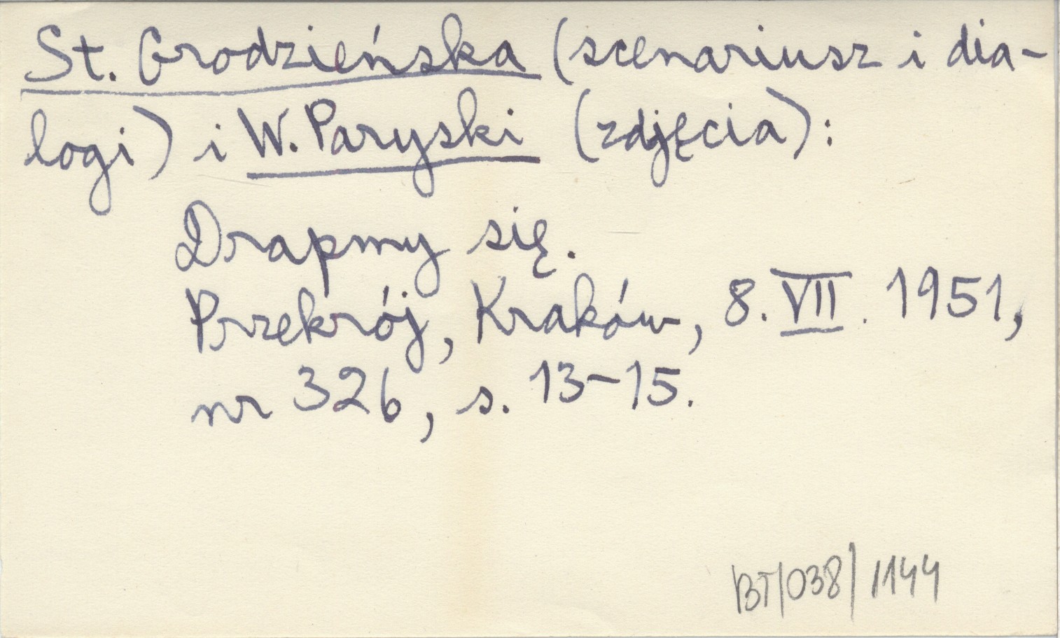 Przekrój (Kraków) , 8 VII 1951, nr 326: 13-15. St. Grodzieńska (scenariusz i dialogi) i W. Paryski (zdjęcia)