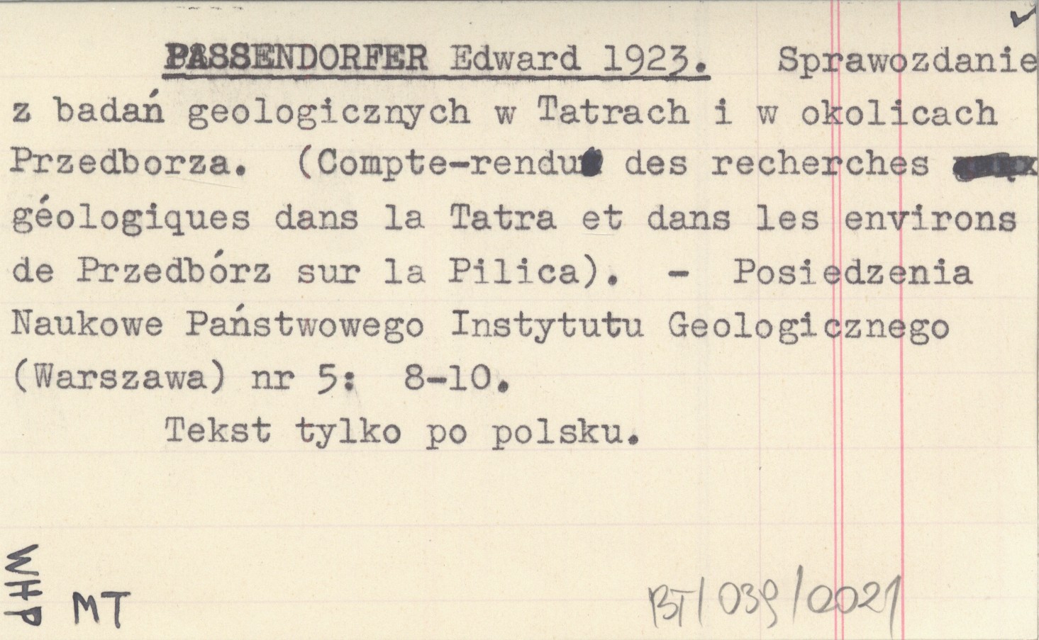 PASSENDORFER Edward 1923 Sprawozdanie z badań geologicznych w Tatrach i w okolicach Przedborza. (Compte-rendu des recherches géologiques dans la Tatra et dans les environs de Przedbórz sur la Pilica).