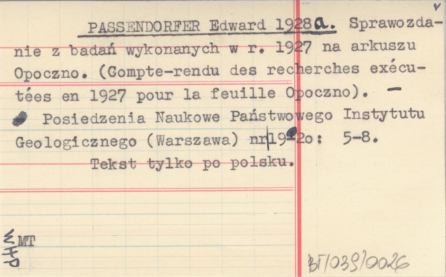 PASSENDORFER Edward 1928 a Sprawozdanie z badań wykonanych w r. 1927 na arkuszu Opoczno. (Compte-rendu des recherches exécutées en 1927 pour la feuille Opoczno).