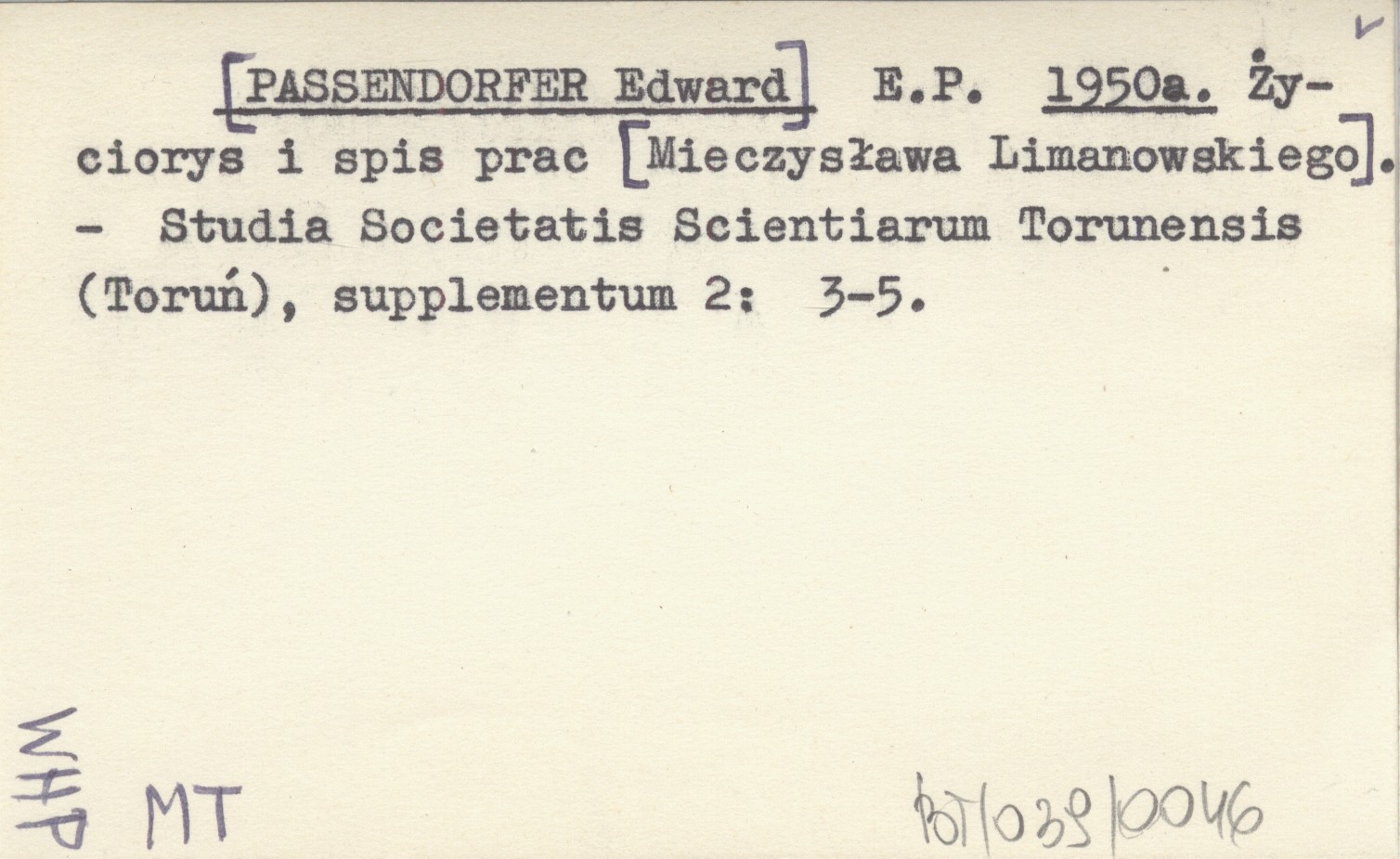 E. P. [PASSENDORFER Edward] 1950 a Życiorys i spis prac [Mieczysława Limanowskiego].