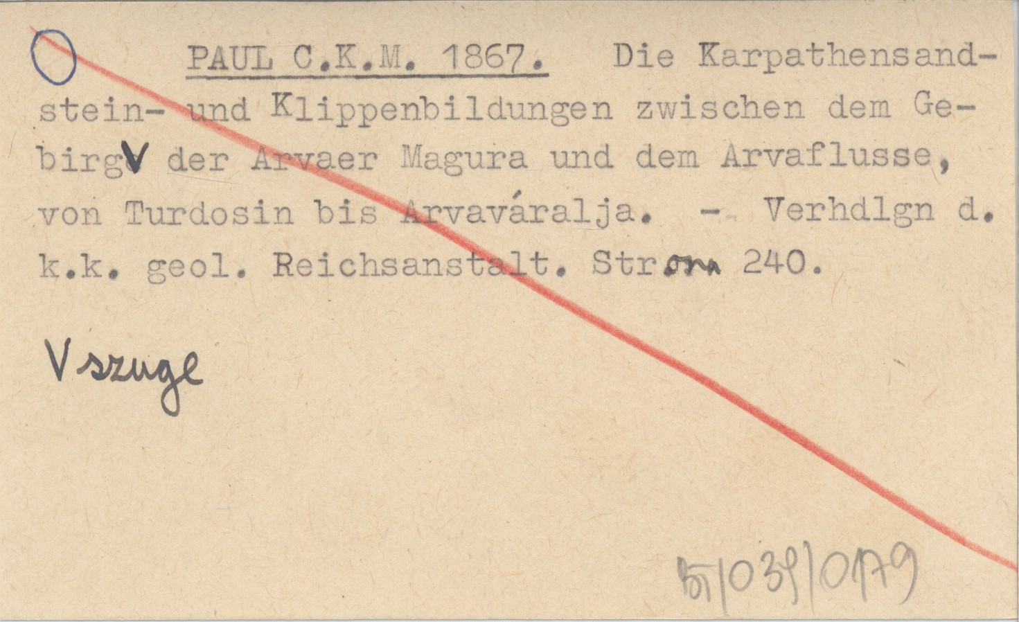 PAUL C. K. M. 1867 Die Karpathensandstein- und Klippenbildungen zwischen dem Gebirgszuge der Arvaer Magura und dem Arvaflusse, von Turdosin bis Arvaváralja.