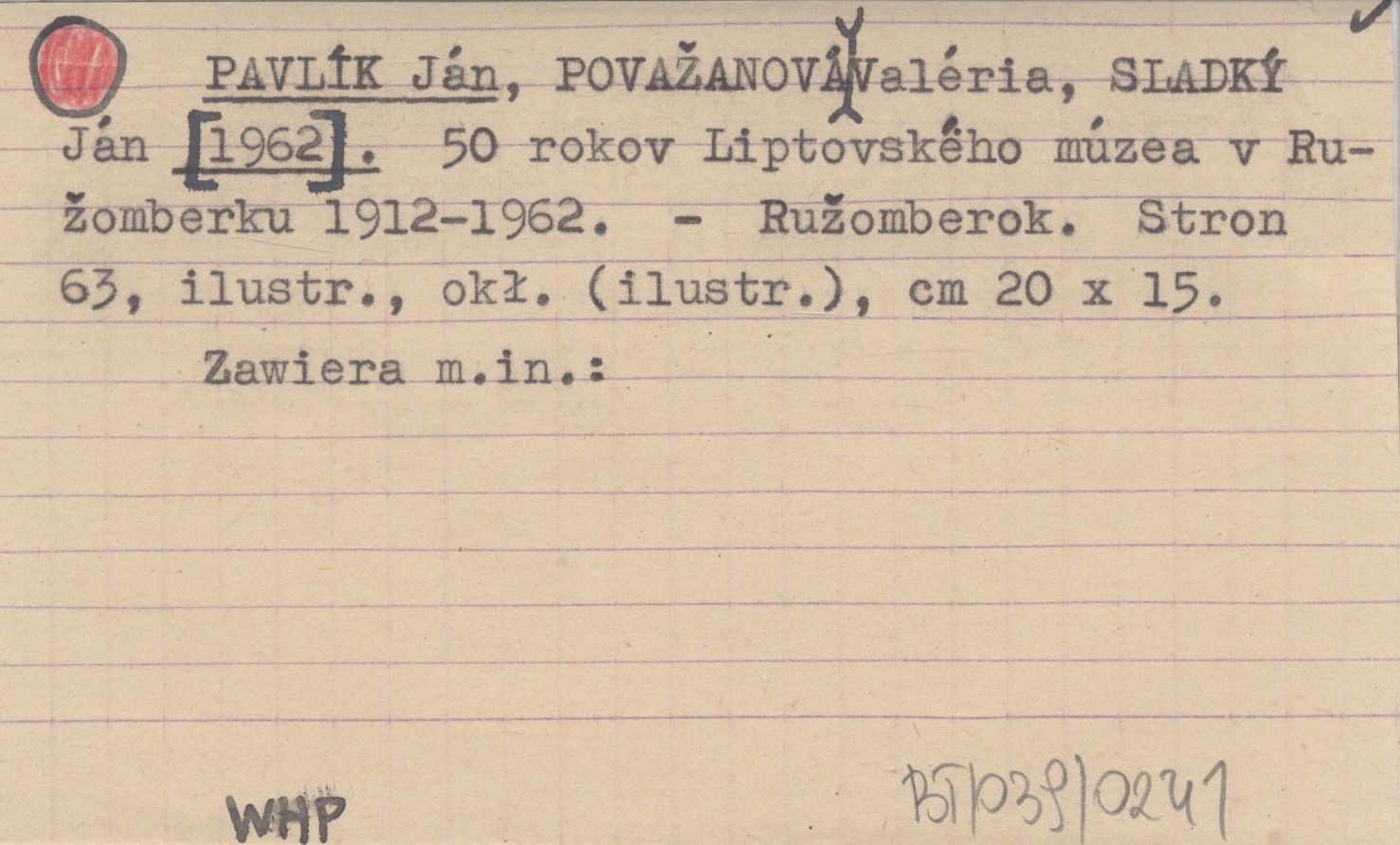 PAVLÍK Ján POVA®ANOVÁ, Valéria. ; SLADKÝ, Ján. ; [1962] 50 rokov Liptovského múzea v Ru¾omberku 1912-1962.
