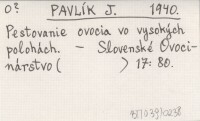 PAVLÍK J. 1940 Pestovanie ovocia vo vysokých polohách.