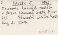 PAVLÍK J. 1942 Sbieranie liečivých rastlín v okrese Liptovský Svätý Mikuláš.