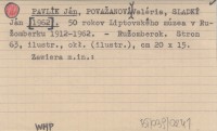 PAVLÍK Ján POVAŽANOVÁ, Valéria. ; SLADKÝ, Ján. ; [1962] 50 rokov Liptovského múzea v Ružomberku 1912-1962.