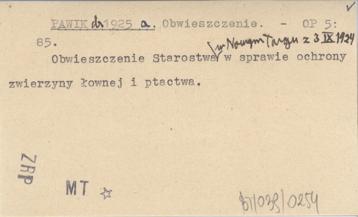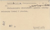 Ochrona Przyrody, 5: 85. Obwieszczenie Starostwa w Nowym Targu z 3 IX 1924 w sprawie ochrony zwierzyny łownej i ptactwa.