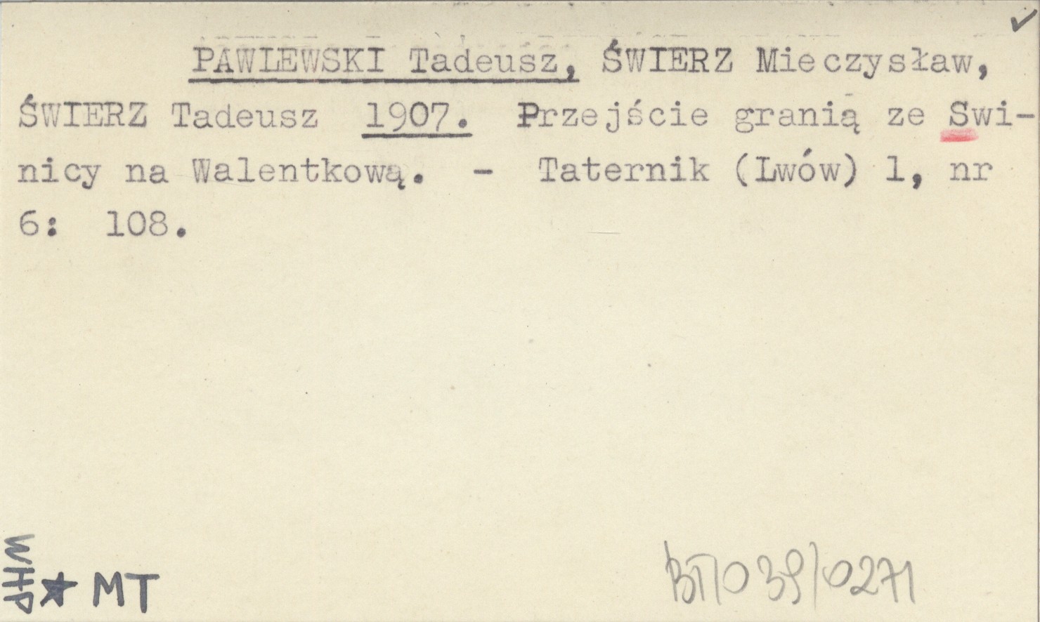 PAWLEWSKI Tadeusz ŚWIERZ, Mieczysław. ; ŚWIERZ, Tadeusz. ; 1907 Przejście granią ze Swinicy na Walentkową.