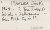 [PAWLICA Józef] 1924... Z Tow. Związek Górali w Zakopanem.