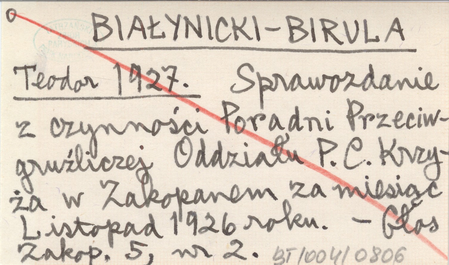 BIAŁYNICKI-BIRULA Teodor 1927 Sprawozdanie z czynności Poradni Przeciwgruźliczej Oddziału P.C. Krzyża w Zakopanem za miesiąc Listopad 1926 roku.