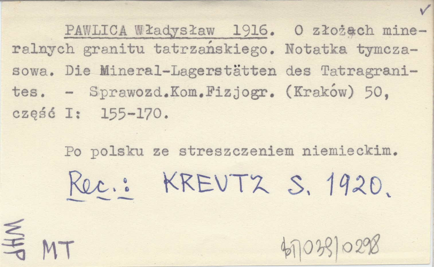 PAWLICA Władysław 1916 O złożach mineralnych granitu tatrzańskiego. Notatka tymczasowa. Die Mineral-Lagerstätten des Tatragranites.