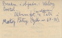 Kraków , 31 s., il., 71 k. (4 rozkładane), okł., 20x27 cm. Album fotograficzny ze zdjęciami z Tatr i Małej Fatry (tylko nr 67-70). Przedmowa i objaśnienia: Walery Goetel. REC: Wierchy (Kraków) 8 (1930): 240-241 ; SZCZEPAŃSKI J. A. 1931 y ; NIEMCÓWNA Stanisława, Orli Lot (Kraków) 12 (1931), nr 8-9: 150-151 ;