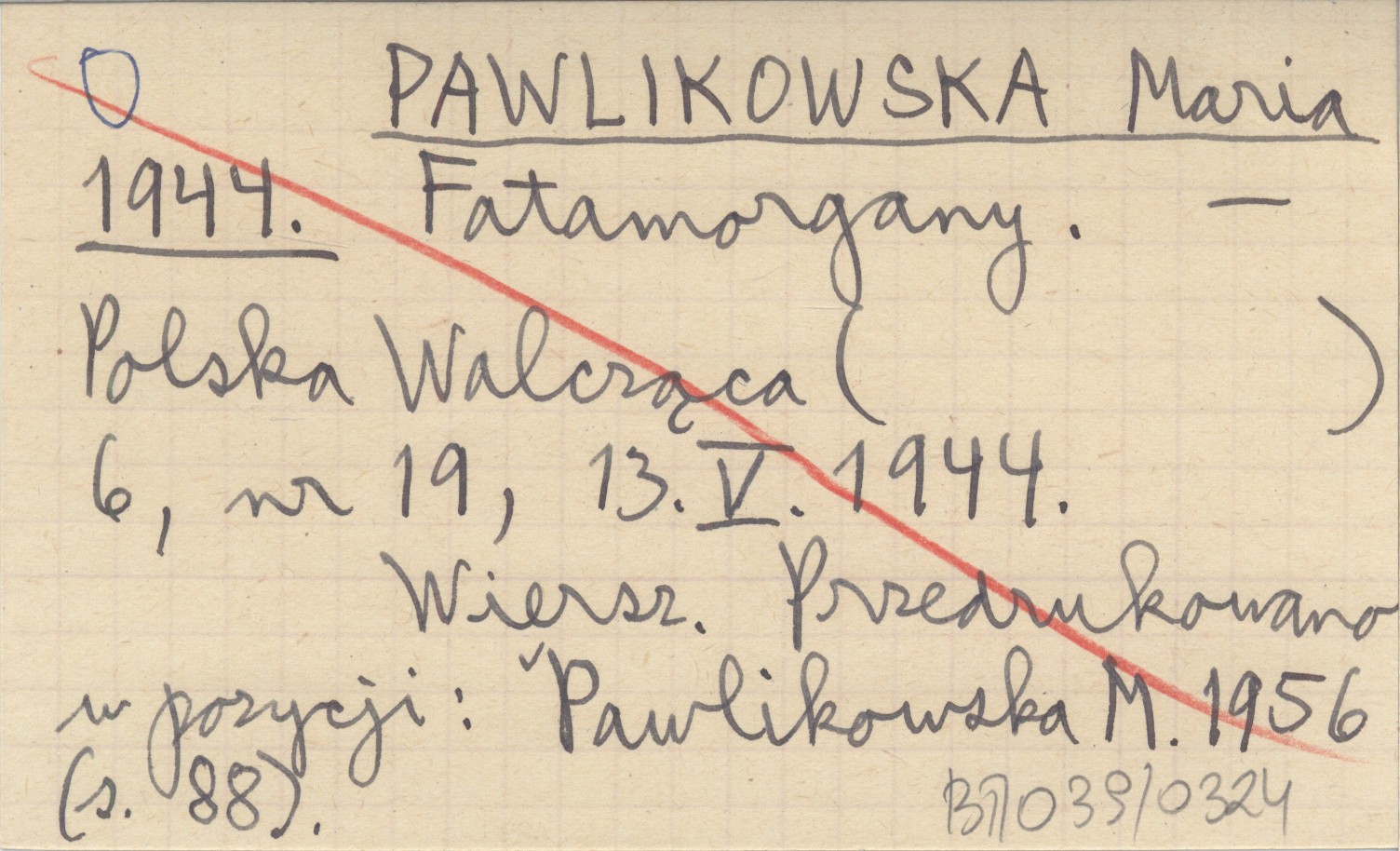 Polska Walcząca, 6, nr 19 (13 V 1944). Wiersz. Przedrukowano w pozycji: PAWLIKOWSKA M. 1956: 88.