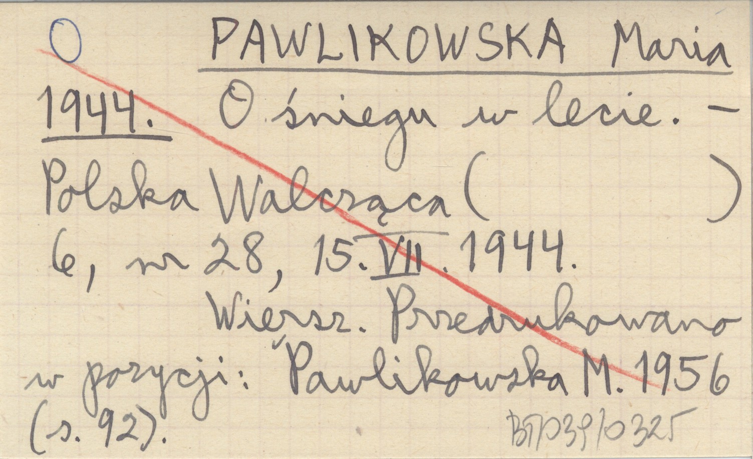 Polska Walcząca, 6, nr 28 (15 VII 1944). Wiersz. Przedrukowano w pozycji: PAWLIKOWSKA M. 1956: 92.