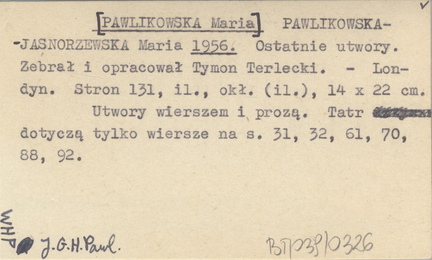 PAWLIKOWSKA-JASNORZEWSKA Maria [PAWLIKOWSKA Maria] 1956 Ostatnie utwory. Zebrał i opracował Tymon Terlicki.