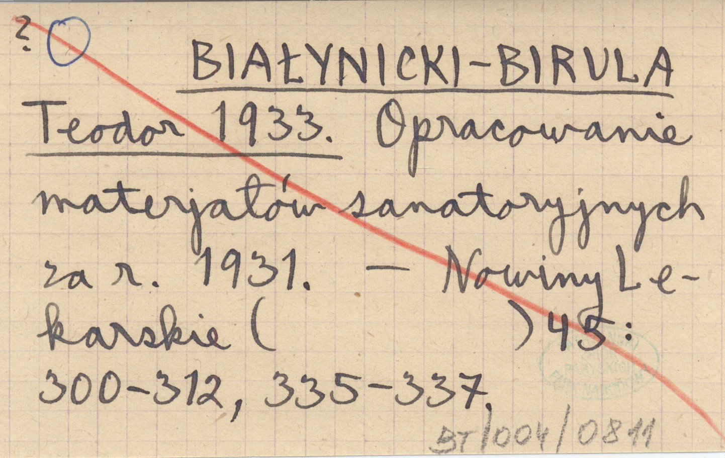 BIAŁYNICKI-BIRULA Teodor 1933 Opracowanie materjałów sanatoryjnych za r. 1931.