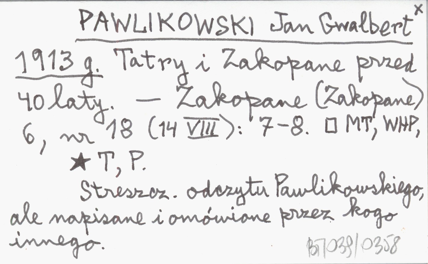 Zakopane (Zakopane) , 6, nr 18 (14 VIII): 7-8. Streszczenie odczytu Pawlikowskiego, ale napisane i omówione przez kogo innego.