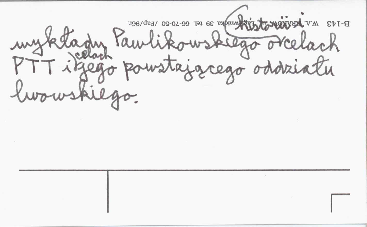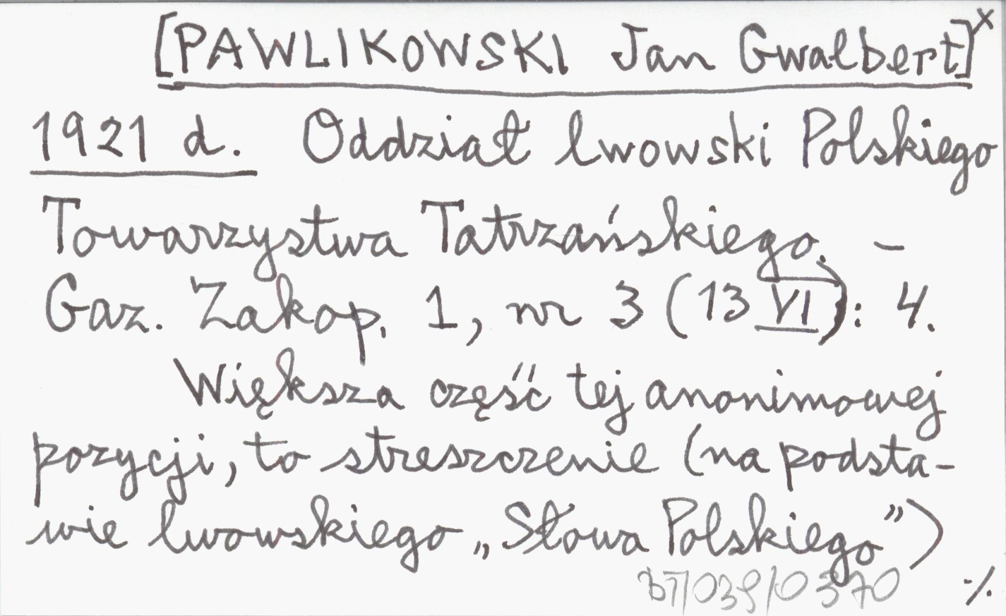 Gazeta Zakopiańska, 1, nr 3 (13 VI): 4. Większa część tej anonimowej pozycji, to streszczenie (na podstawie lwowskiego "Słowa Polskiego"), wykładu Pawlikowskiego o historii i o celach PTT i celach jego powstającego oddziału lwowskiego.