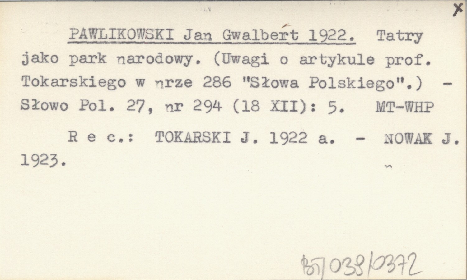 PAWLIKOWSKI Jan Gwalbert 1922 Tatry jako park narodowy. (Uwagi o artykule prof. Tokarskiego w nrze 286 "Słowa Polskiego").