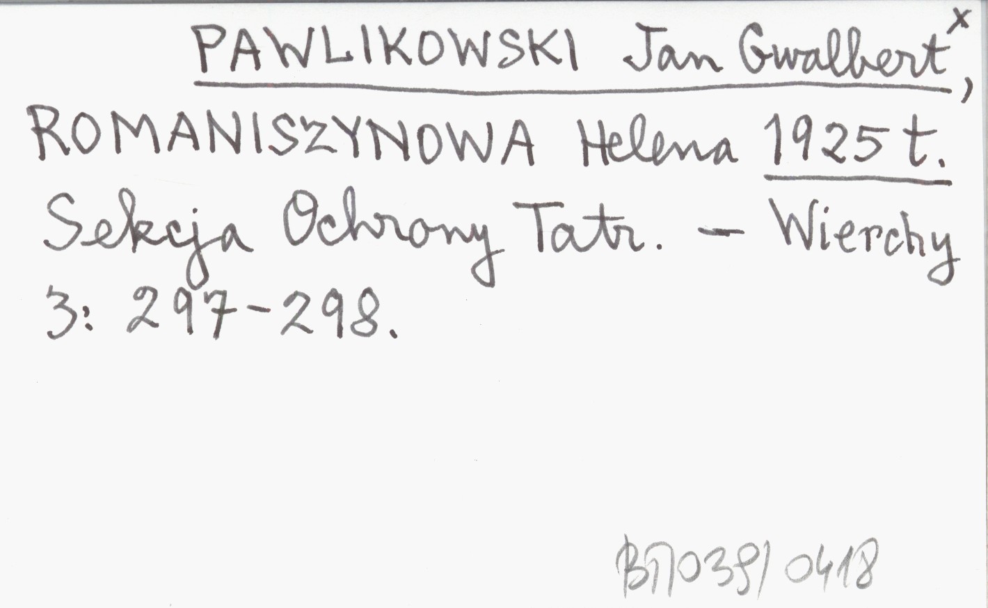 PAWLIKOWSKI Jan Gwalbert ROMANISZYNOWA, Helena. ; 1925 t Sekcja Ochrony Tatr.