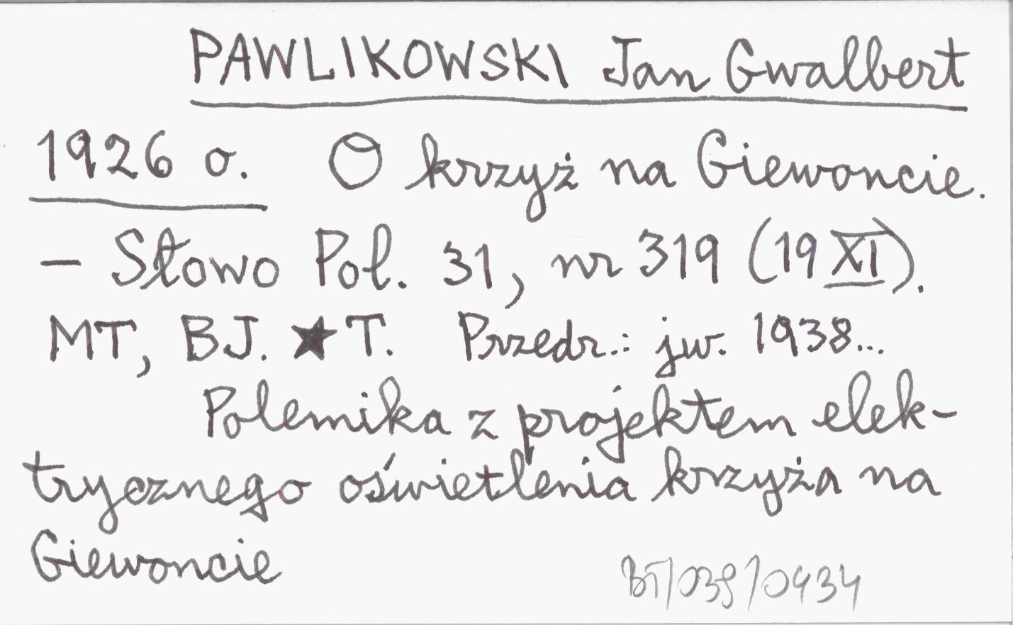 Słowo Polskie, 31, nr 319 (19 XI). Polemika z projektem elektrycznego oświetlenia krzyża na Giewoncie. Przedruk: jw. 1938...