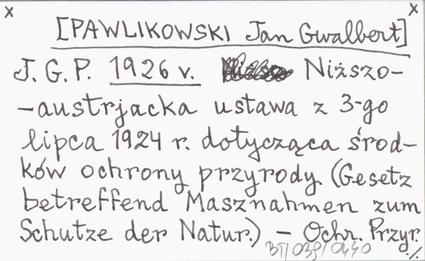 J. G. P. [PAWLIKOWSKI Jan Gwalbert] 1926 v Niższo-austrjacka ustawa z 3-go lipca 1924 r. dotycząca środków ochrony przyrody. (Gesetz betreffend Masznahmen zum Schutze der Natur.).