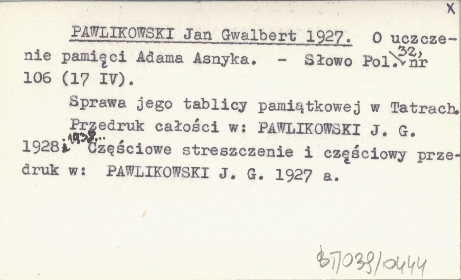 Słowo Polskie, 32, nr 106 (17 IV). Sprawa jego tablicy pamiątkowej w Tatrach. Przedruk całości w: PAWLIKOWSKI J. G. 1928 i 1938... Częściowe streszczenie i częściowy przedruk w: PAWLIKOWSKI J. G. 1927 a.