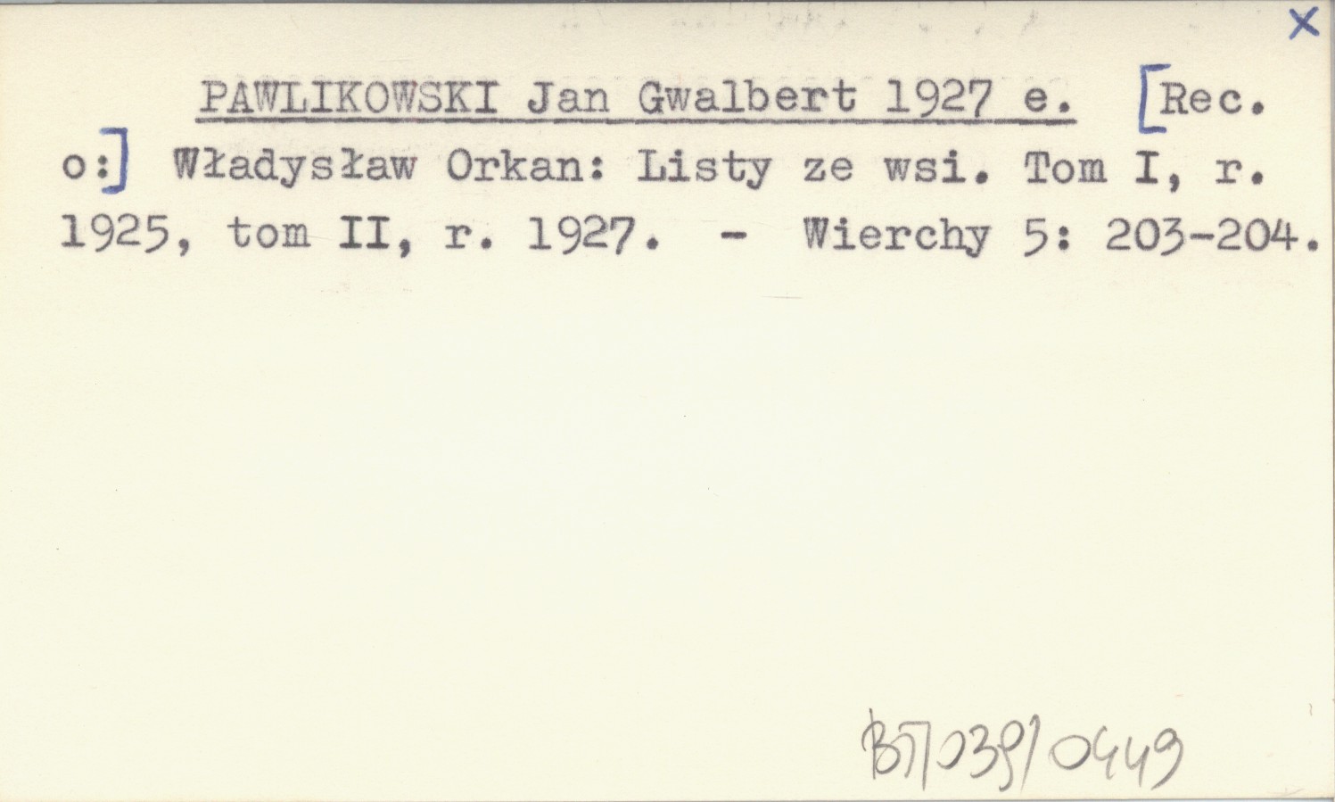 PAWLIKOWSKI Jan Gwalbert 1927 e [Rec. o:] Władysław Orkan: Listy ze wsi. Tom I, r. 1925, tom II, r. 1927.
