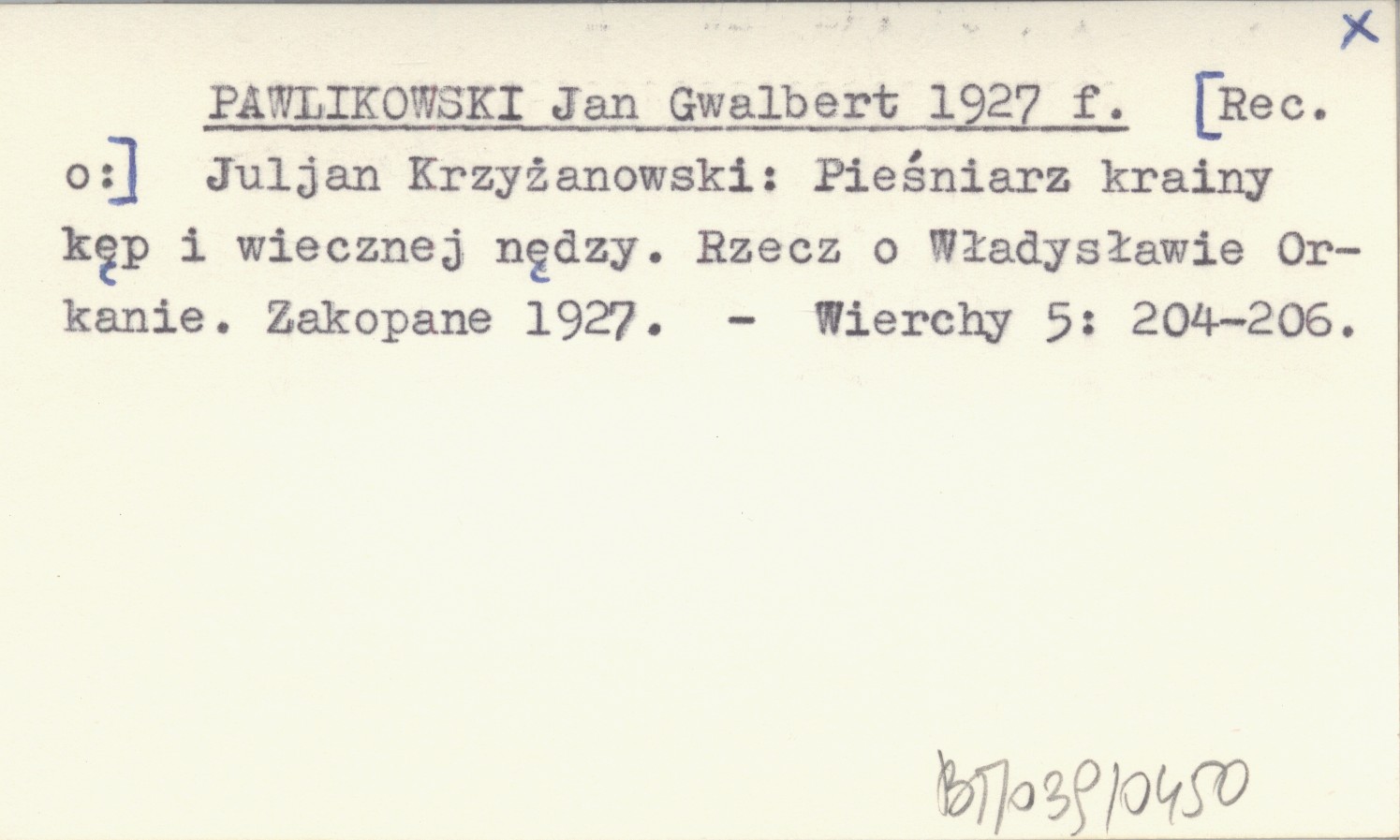 PAWLIKOWSKI Jan Gwalbert 1927 f [Rec. o:] Julijan Krzyżanowski: Pieśniarz krainy kęp i wiecznej nędzy. Rzecz o Władysławie Orkanie. Zakopane 1927.