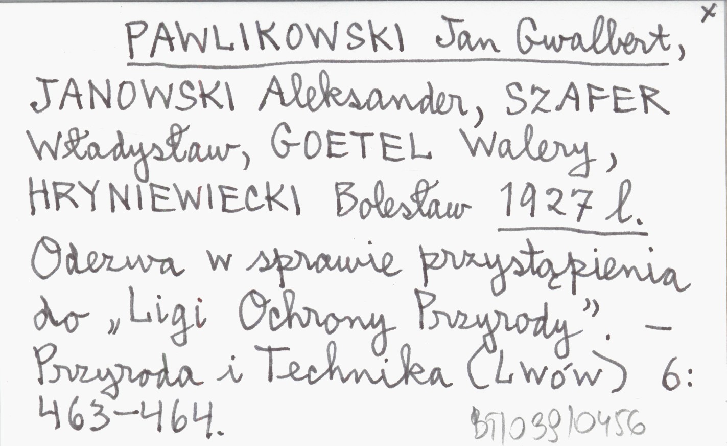 PAWLIKOWSKI Jan Gwalbert JANOWSKI, Aleksander. ; SZAFER, Władysław. ; GOETEL, Walery. ; HRYNIEWIECKI, Bolesław. ; 1927 l Odezwa w sprawie przystąpienia do "Ligi Ochrony Przyrody".