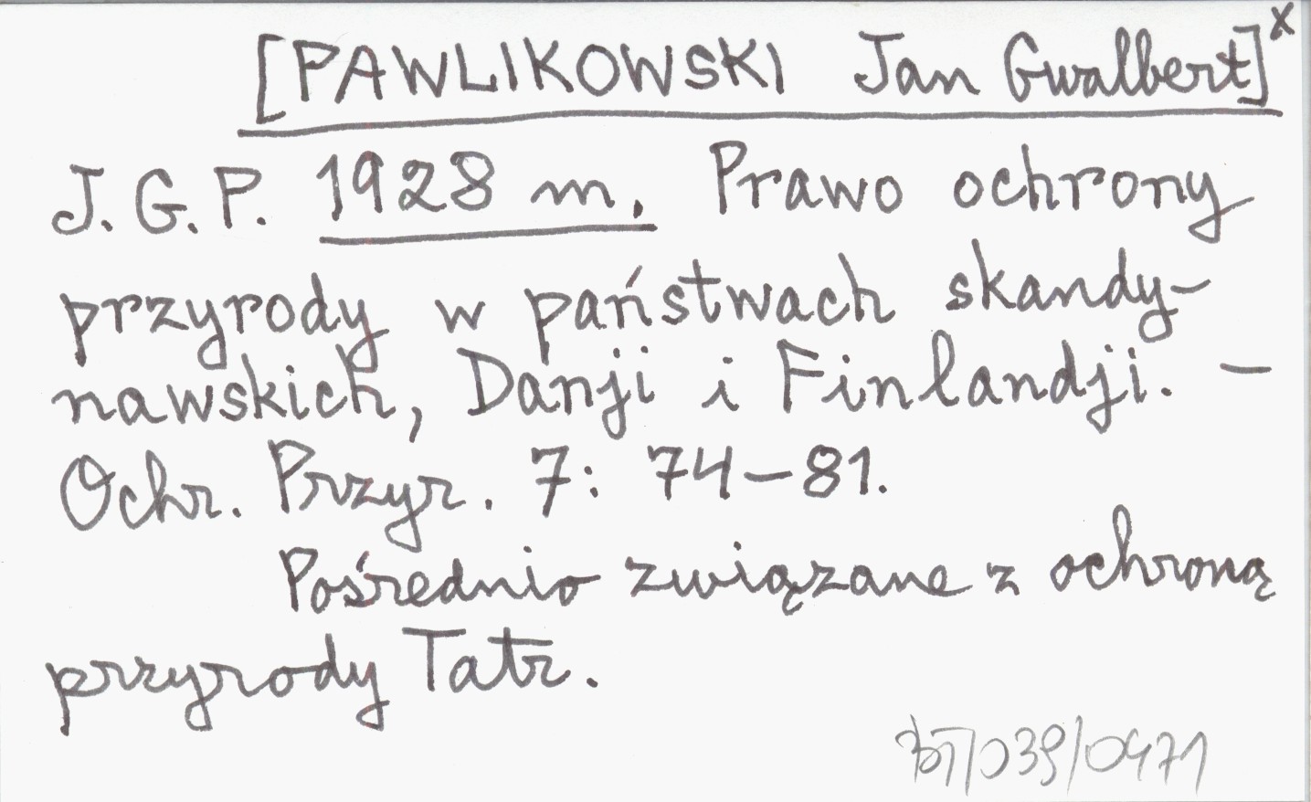 J. G. P. [PAWLIKOWSKI Jan Gwalbert] 1928 m Prawo ochrony przyrody w państwach skandynawskich, Danji i Finlandji.