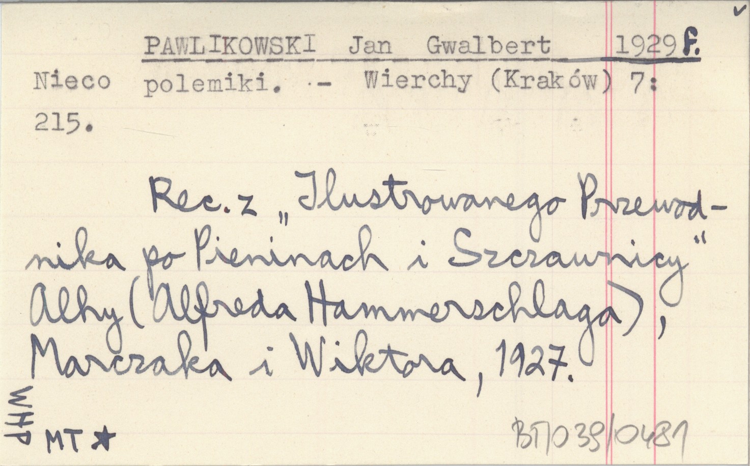 Wierchy (Kraków) , 7: 215. Rec. z: "Ilustrowanego Przewodnika po Pieninach i Szczawnicy" Alhy (Alfreda Hammerschlaga), Marczaka i Wiktora, 1927.