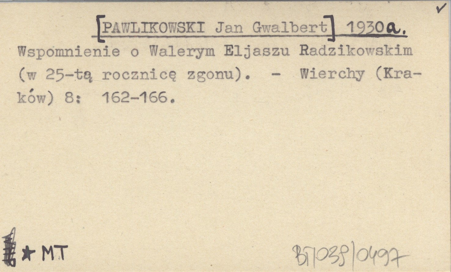 [PAWLIKOWSKI Jan Gwalbert] 1930 a Wspomnienie o Walerym Eljaszu Radzikowskim (w 25-tą rocznicę zgonu).