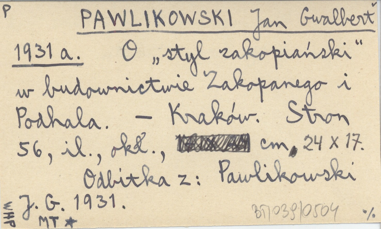 PAWLIKOWSKI Jan Gwalbert 1931 a O "stylu zakopiańskim" w budownictwie Zakopanego i Podhala.