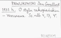 PAWLIKOWSKI Jan Gwalbert 1931 a O "stylu zakopiańskim" w budownictwie Zakopanego i Podhala.